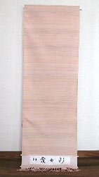 このきものは遠くからだと無地にも見えるとても優しいピンク色ですが、薄いオレンジなどの横縞が細く入っています。 使いまわしの効くきものです。
